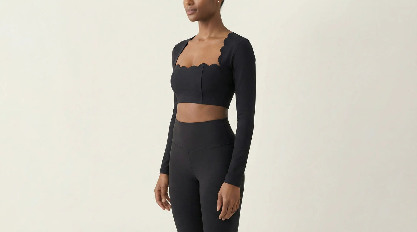 alt="Une photographie de studio centrée sur le buste d'une femme portant un top noir ajusté. Le vêtement est un haut court (crop top) de style boléro intégré avec des manches longues. La caractéristique majeure est son encolure carrée profonde soulignée par une bordure en festons arrondis (scalloped edges). Le textile semble être un jersey de haute qualité ou une matière synthétique mate. La composition est un plan serré de trois-quarts"